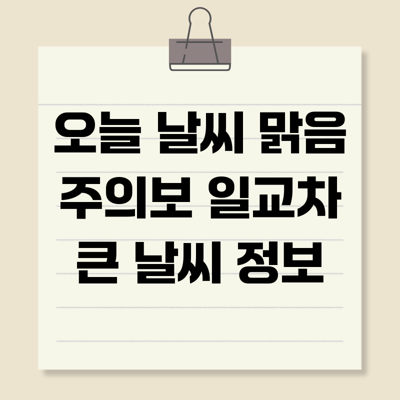맑은 하늘 아래 숨겨진 위험: 일교차 큰 날씨 건강 관리법오늘, 쾌청한 하늘이 우리를 반기지만, 기온 변화라는 숨겨진 위험이 도사리고 있습니다. 아침저녁의 쌀쌀함과 한낮의 따뜻함이 공존하는 변덕스러운 날씨는 우리 건강에 적신호를 켤 수 있습니다. 단순한 날씨 정보 전달을 넘어, 이러한 일교차가 우리 몸에 미치는 영향과 건강 관리법을 심층적으로 분석하여, 독자 여러분의 건강한 하루를 돕고자 합니다.오늘의 날씨: 맑음 뒤에 숨은 일교차 주의보오늘 전국은 대체로 맑은 날씨를 보이겠지만, 일교차가 10도 이상 크게 벌어지는 곳이 많을 것으로 예상됩니다. 특히, 환절기에는 이러한 기온 변화에 우리 몸이 제대로 적응하지 못해 다양한 건강 문제가 발생할 수 있습니다. 기상청 발표에 따르면, 서울의 경우 최저 기온은 ..