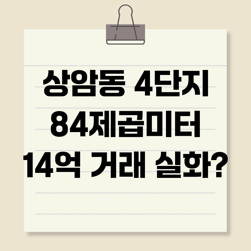 상암 4단지 84㎡ 14억 거래, 진실일까? 부동산 시장 분석최근 상암동 4단지 아파트 84제곱미터가 14억 원에 거래되었다는 소식이 온라인 커뮤니티를 뜨겁게 달구고 있습니다. 정말 이 가격이 실거래된 것인지, 아니면 단순한 허위 매물일까요? 만약 실거래가 맞다면, 이는 서울 부동산 시장에 어떤 의미를 가지는 걸까요? 이번 글에서는 해당 거래의 진위를 확인하고, 만약 사실이라면 이례적인 가격 상승의 배경과 함께 서울 부동산 시장에 미치는 영향, 그리고 앞으로의 전망까지 심층적으로 분석해 보겠습니다.상암동 4단지 84㎡ 14억 거래, 사실일까?우선, 해당 거래의 진위 여부를 확인하는 것이 중요합니다. 단순히 온라인 커뮤니티에 떠도는 소문만으로는 섣불리 판단할 수 없습니다. 국토교통부 실거래가 공개시스템을 ..